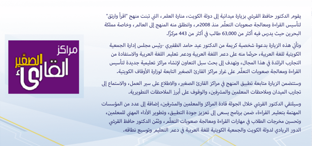 يتشرّف الدكتور حافظ القرشي، مؤلّف منهج القارئ الصغير (اقرأ وارتق)،